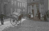 Kapoenstraat, gezien in de richting van de Groenmarkt. Links een visverkoopster. Aan het eind rechts woonde Lipperhey, uitvinder van de telescoop. 1890-1900, bron: Zeeuwsarchief